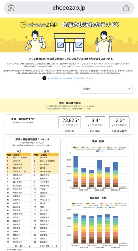 チョコザップ(chocoZAP)の公式HP内の「お店の状況わかるナビ」で店舗の清掃・備品補充状況とマシン・サービスの故障状況が、見えるようになっています。