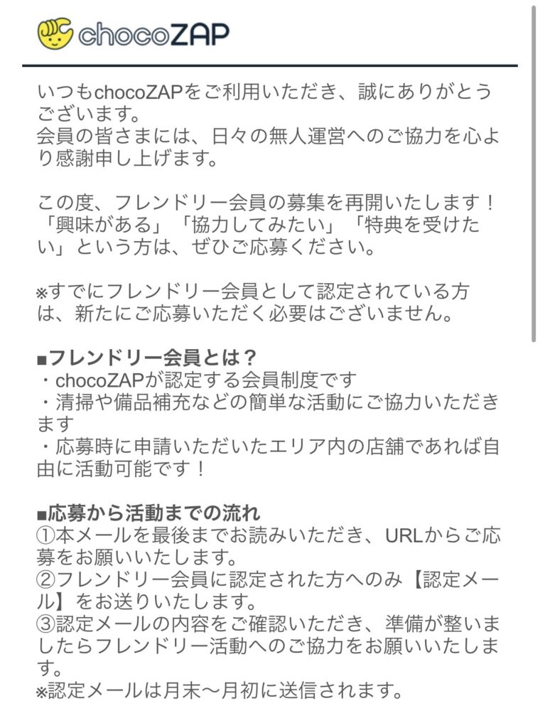フレンドリー会員は、チョコザップ運営から募集メールが届いた人のみ応募可能で、その後に選考があります。