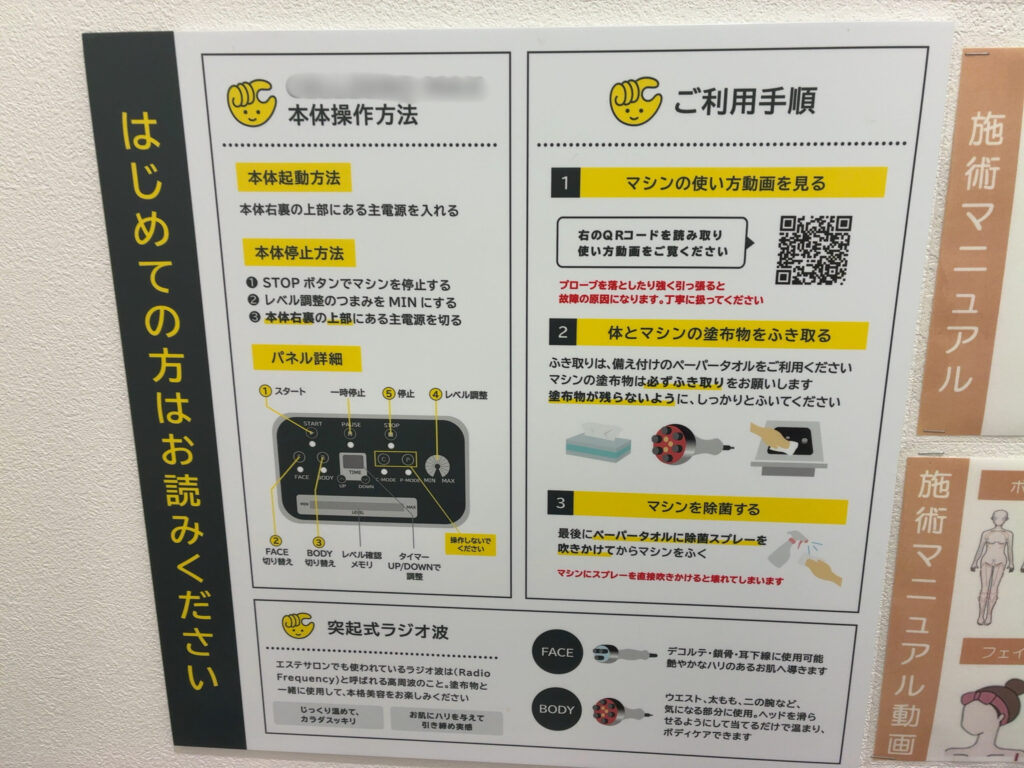 部屋の中にマシンの使い方の掲示がしてあるのと、部位ごとの使用方法案内の動画をQRコード読み込みで視聴できます。